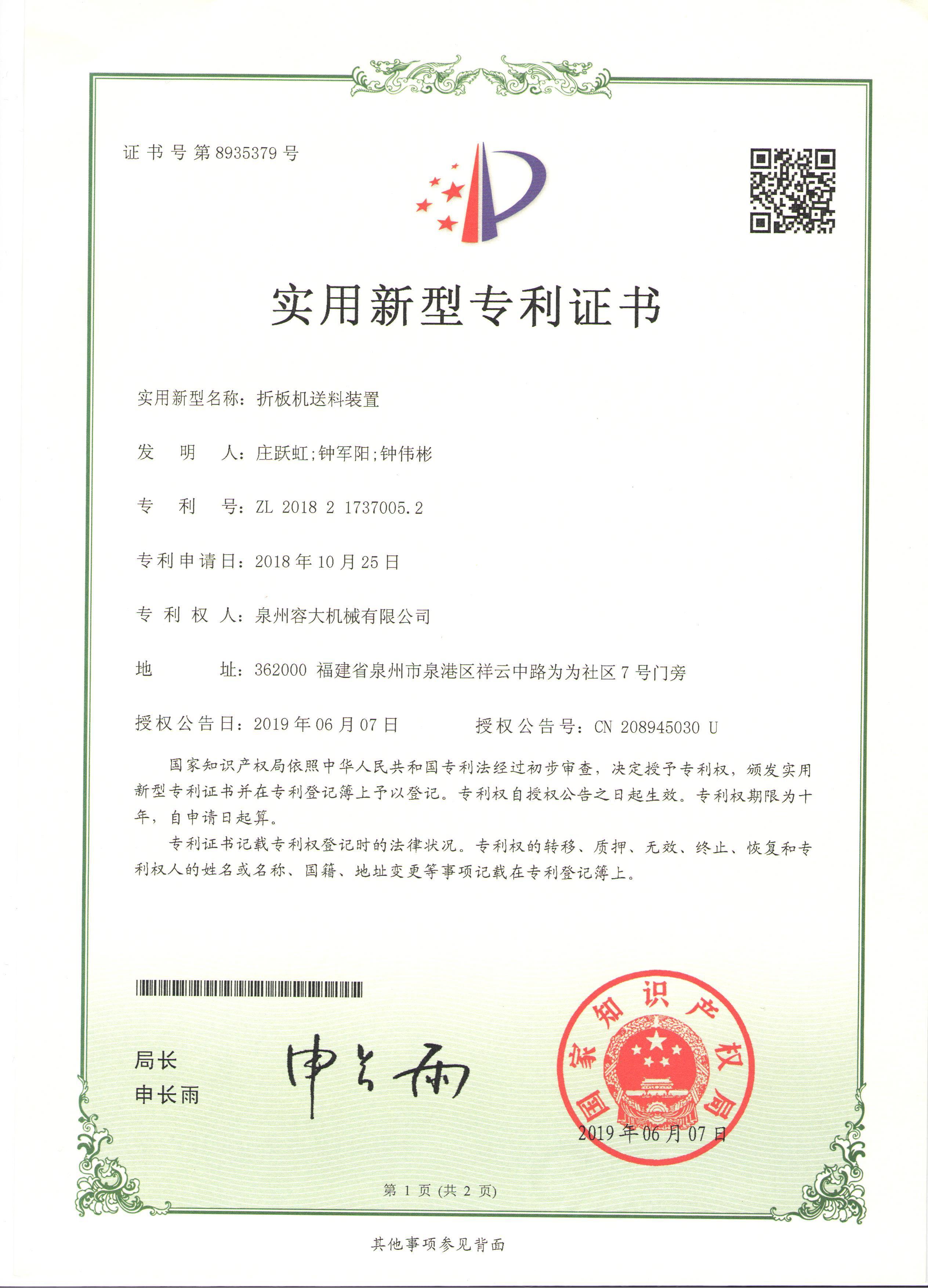 您的位置: 泉州容大機(jī)械有限公司 > 專利證書 > 剪板機(jī)送料裝置